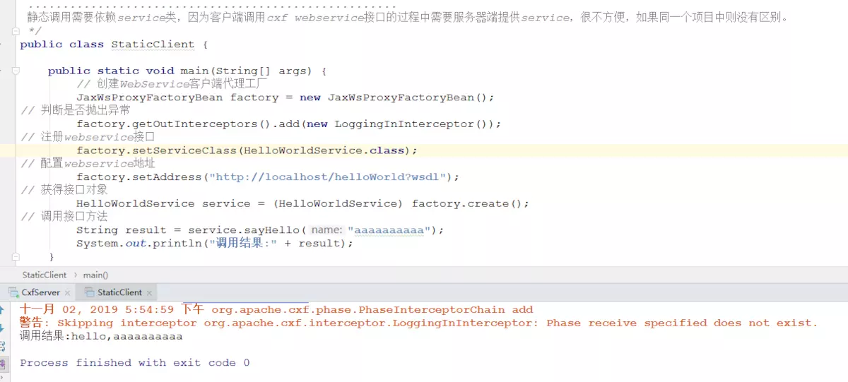 2.手动编写客户端静态调用代码 1 2 3 4 5 6 7 8 9 10 11 12 13 14 15 16 17 18 19 20 21 22 23 24 25 26 27 28 29 30 31 32 33 34 35 36 37 38 39 40 41 42 43 44 45 46 47 48 49 50 51 52 53 54 55 56 57 58 59 package com.tg.cxf; /** * <p>description:</p> * * @author tanggao * @date 2019/10/22 22:05 * @version 1.0 */ import org.apache.cxf.interceptor.LoggingInInterceptor; import org.apache.cxf.jaxws.JaxWsProxyFactoryBean; /** * * ......................我佛慈悲...................... * _oo0oo_ * o8888888o * 88" . "88 * (| -_- |) * 0\ = /0 * ___/`---'\___ * .' \\| |// '. * / \\||| : |||// \ * / _||||| -卍-|||||- \ * | | \\\ - /// | | * | \_| ''\---/'' |_/ | * \ .-\__ '-' ___/-. / * ___'. .' /--.--\ `. .'___ * ."" '< `.___\_<|>_/___.' >' "". * | | : `- \`.;`\ _ /`;.`/ - ` : | | * \ \ `_. \_ __\ /__ _/ .-` / / * =====`-.____`.___ \_____/___.-`___.-'===== * `=---=' * ..................................................... ...... 一切有为法,如梦幻泡影,如露亦如电,应作如是观 ........ ......... 三界唯心,万法唯识 ........... ............ bug即空,空即bug,永无bug ............. ..................................................... 静态调用需要依赖service类,因为客户端调用cxf webservice接口的过程中需要服务器端提供service,很不方便,如果同一个项目中则没有区别。 */ public class StaticClient { public static void main(String[] args) { // 创建WebService客户端代理工厂 JaxWsProxyFactoryBean factory = new JaxWsProxyFactoryBean(); // 判断是否抛出异常 factory.getOutInterceptors().add(new LoggingInInterceptor()); // 注册webservice接口 factory.setServiceClass(HelloWorldService.class); // 配置webservice地址 factory.setAddress("http://localhost/helloWorld?wsdl"); // 获得接口对象 HelloWorldService service = (HelloWorldService) factory.create(); // 调用接口方法 String result = service.sayHello("aaaaaaaaaa"); System.out.println("调用结果:" + result); } }