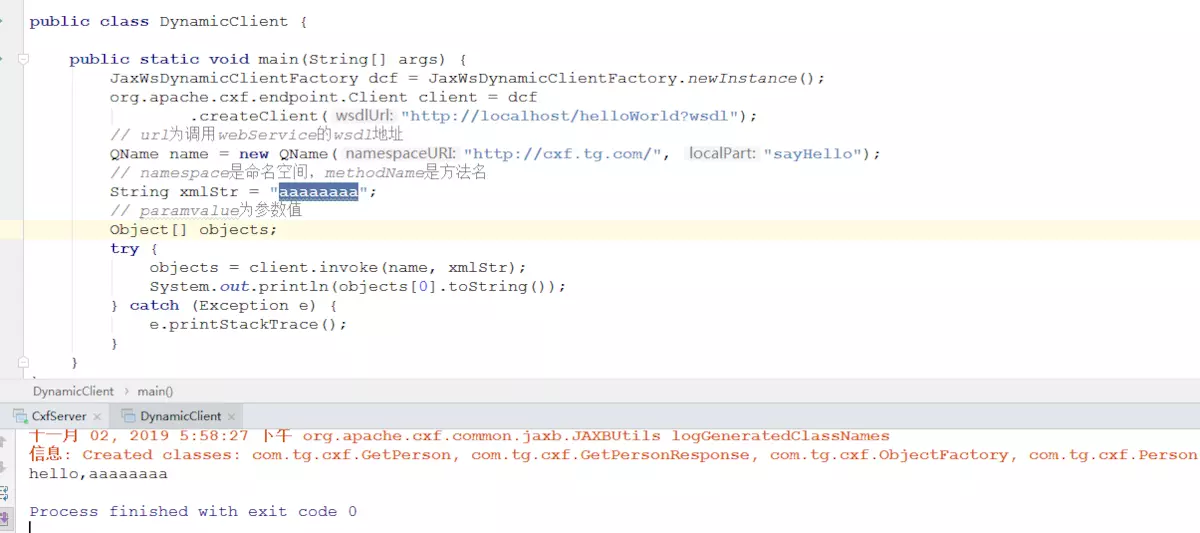 3.手动编写客户端动态调用代码 1 2 3 4 5 6 7 8 9 10 11 12 13 14 15 16 17 18 19 20 21 22 23 24 25 26 27 28 29 30 31 32 33 34 package com.tg.cxf; /** * <p>description:</p> * * @author tanggao * @date 2019/10/22 22:08 * @version 1.0 */ import org.apache.cxf.jaxws.endpoint.dynamic.JaxWsDynamicClientFactory; import javax.xml.namespace.QName; public class DynamicClient { public static void main(String[] args) { JaxWsDynamicClientFactory dcf = JaxWsDynamicClientFactory.newInstance(); org.apache.cxf.endpoint.Client client = dcf .createClient("http://localhost/helloWorld?wsdl"); // url为调用webService的wsdl地址 // namespace是命名空间,methodName是方法名 QName name = new QName("http://cxf.tg.com/", "sayHello"); String xmlStr = "aaaaaaaa"; // paramvalue为参数值 Object[] objects; try { objects = client.invoke(name, xmlStr); System.out.println(objects[0].toString()); } catch (Exception e) { e.printStackTrace(); } } }