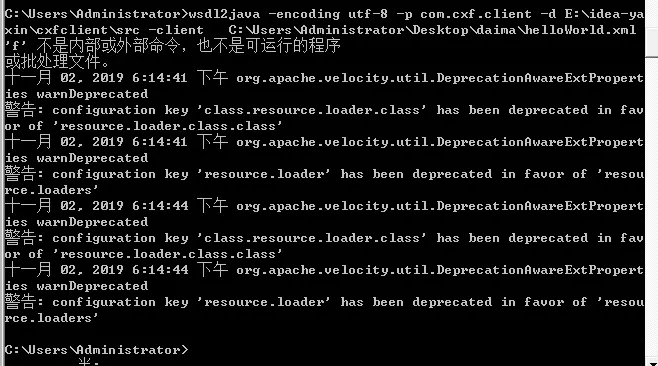 1 wsdl2java -encoding utf-8 -p com.asiainfo.ws.boss -d E:\idea-yaxin\cxfclient\src -client C:\Users\Administrator\Desktop\daima\helloWorld.xml